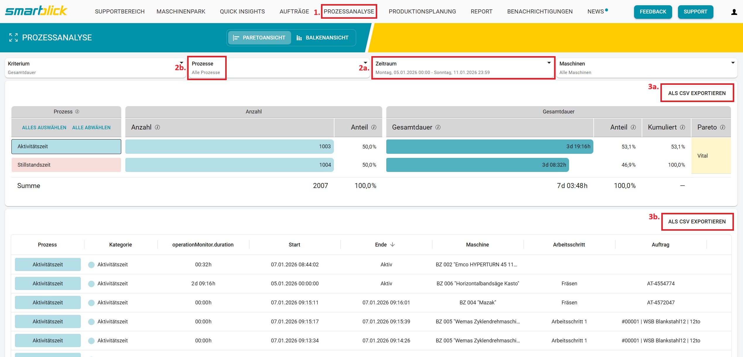 - Wählen Sie die relevanten Prozesse (2a.) sowie den gewünschten Zeitraum (2b.) aus.