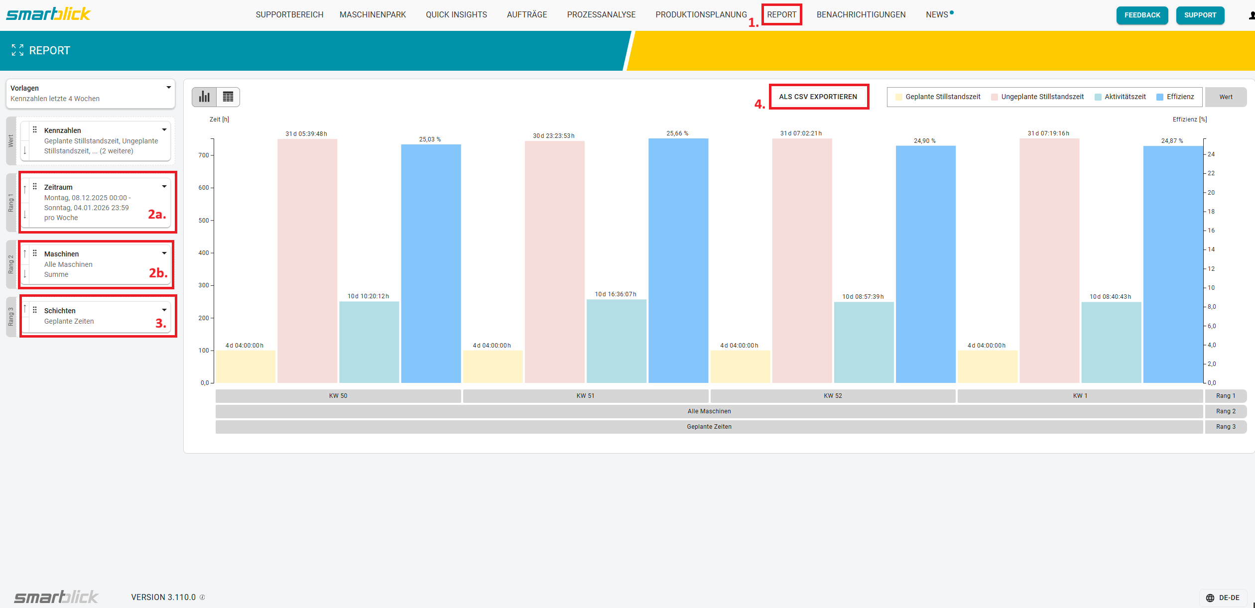 - Wählen den gewünschten Zeitraum (2a.) und die Maschinen (2b.) , für den Sie den Bericht erstellen möchten.